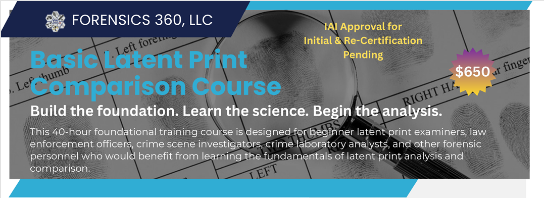 This 40-hour training course designed for the beginner latent print examiner, law enforcement officers, crime scene workers, crime lab analysts, and anyone else who could benefit from learning to analyze latent prints.