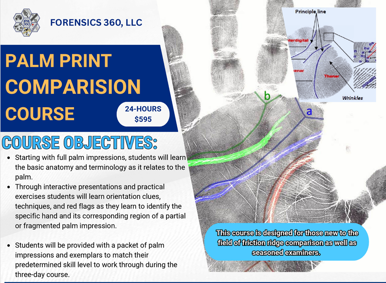 Palm prints don’t have to be intimidating. While many examiners view them as the most challenging friction ridge impressions to analyze, this 24-hour course is designed to break down the complexities and turn confusion into confidence. Through detailed instruction and extensive hands-on comparison exercises, participants will learn how to recognize, interpret, and compare palm prints with clarity and accuracy.